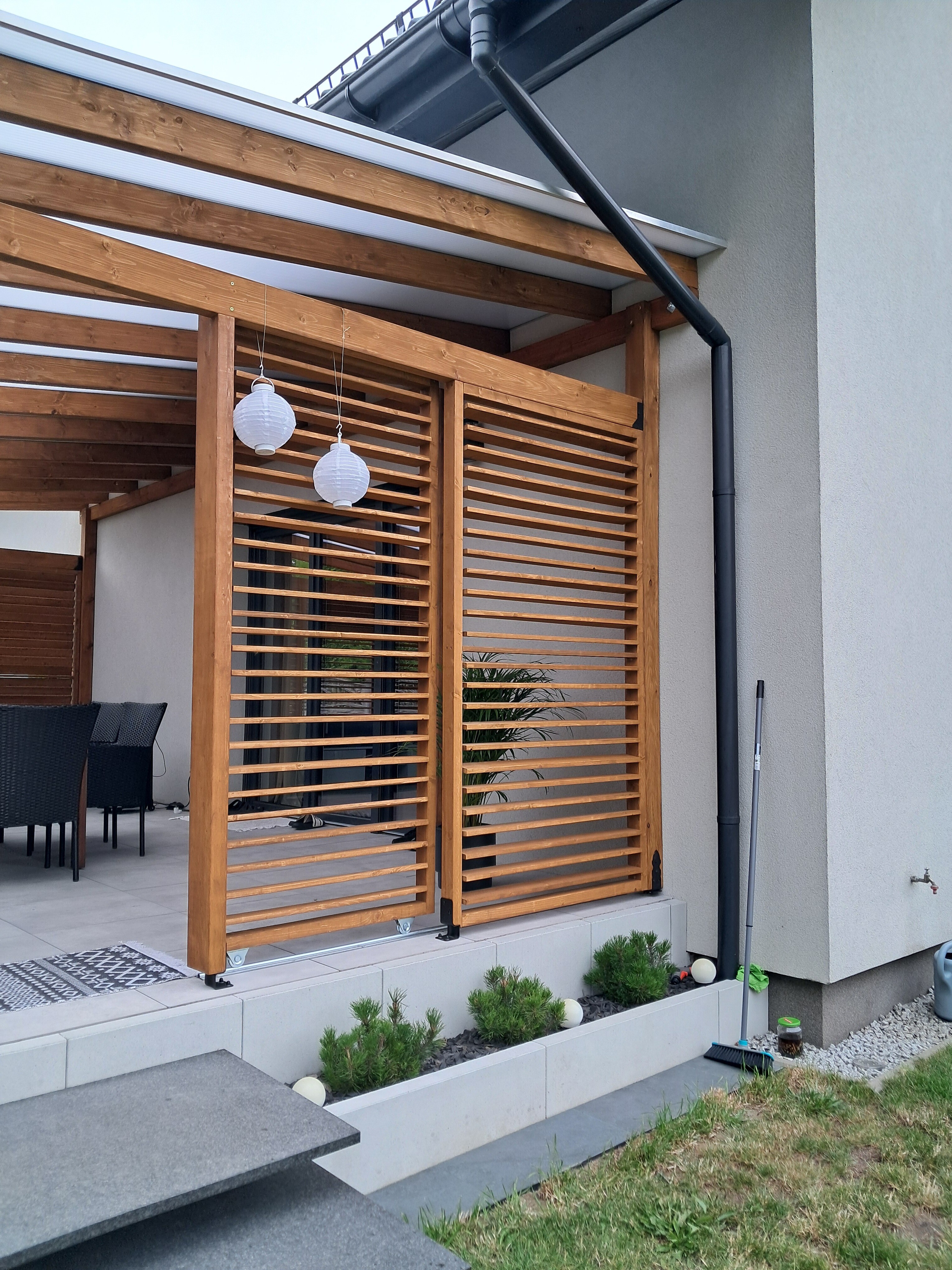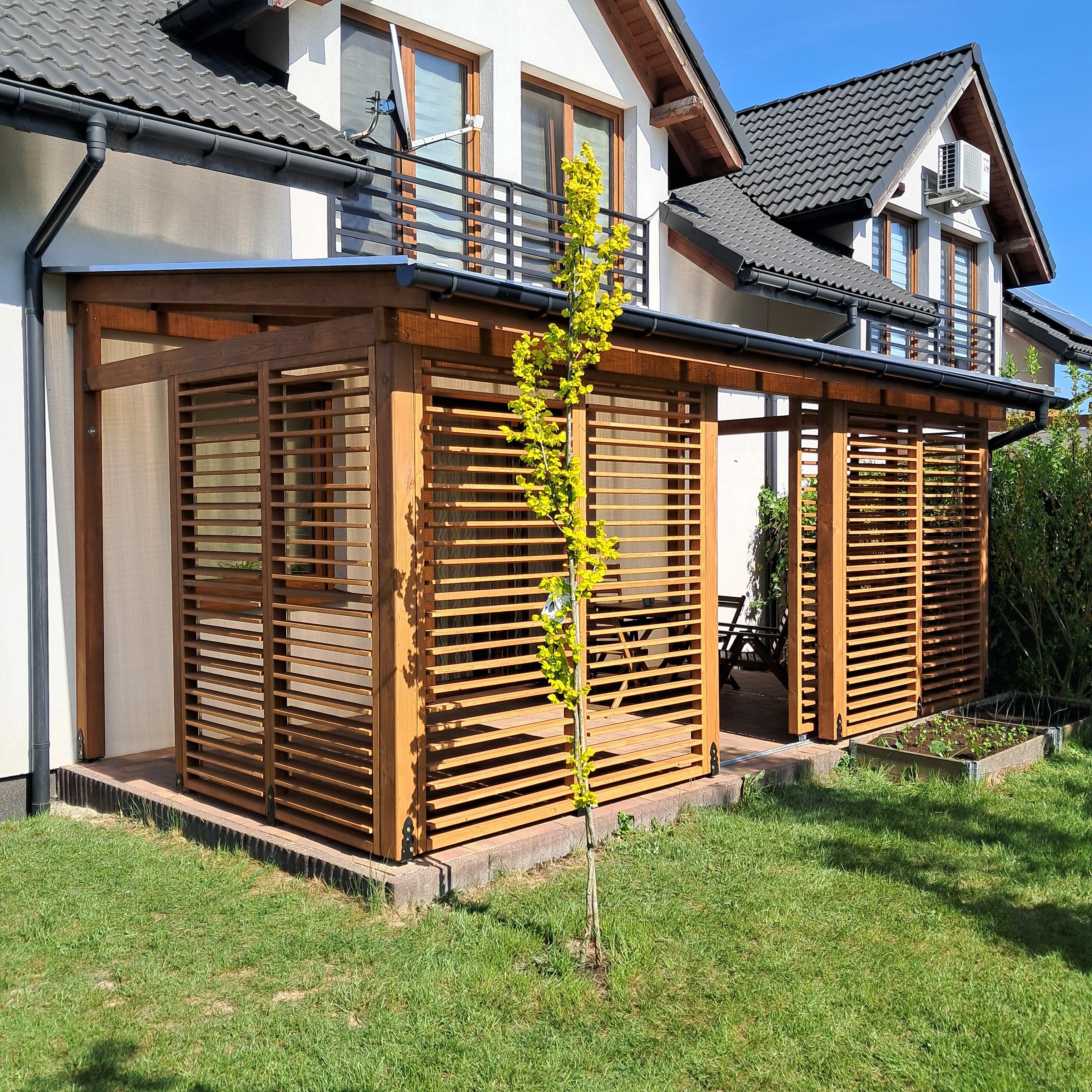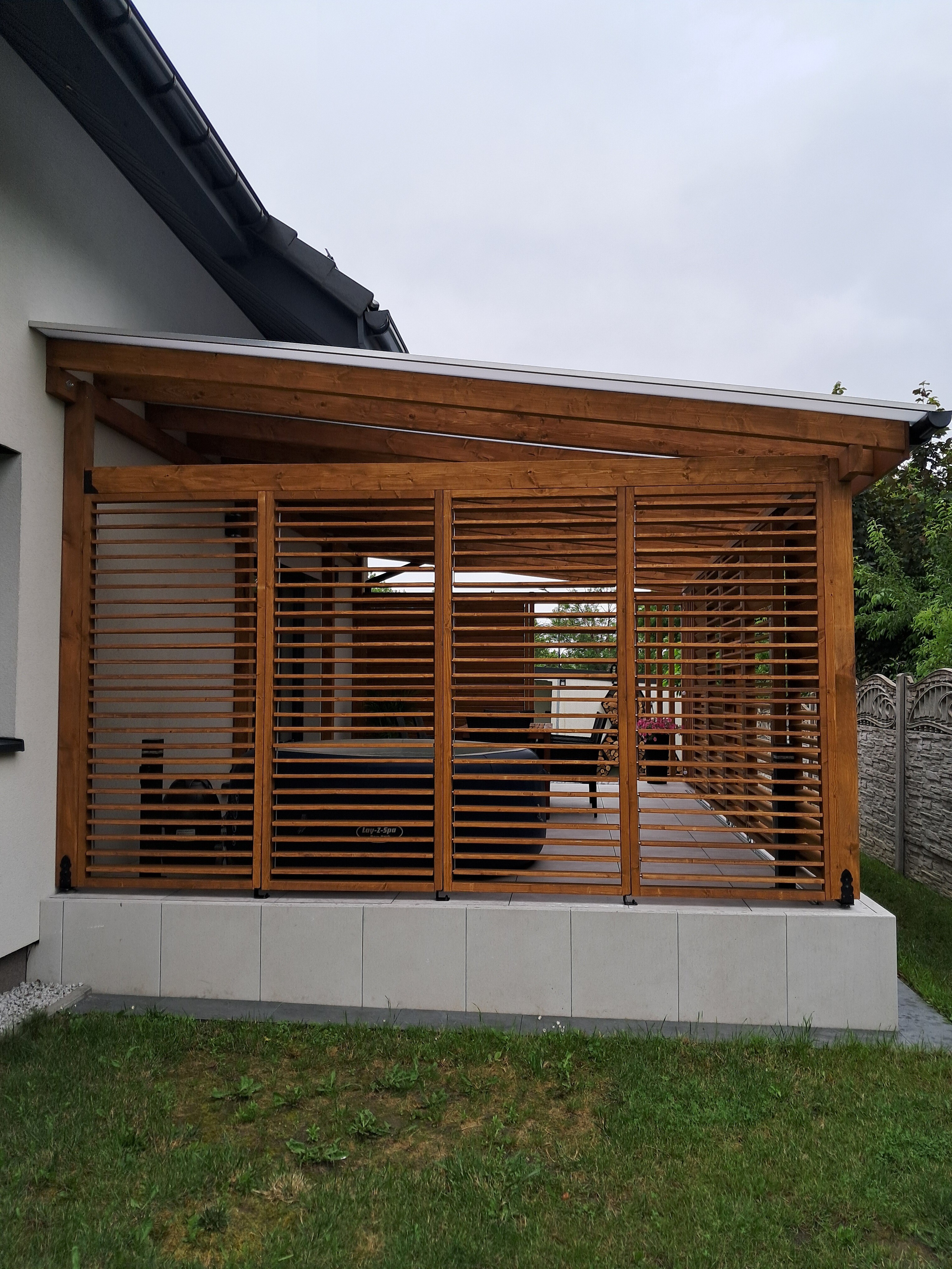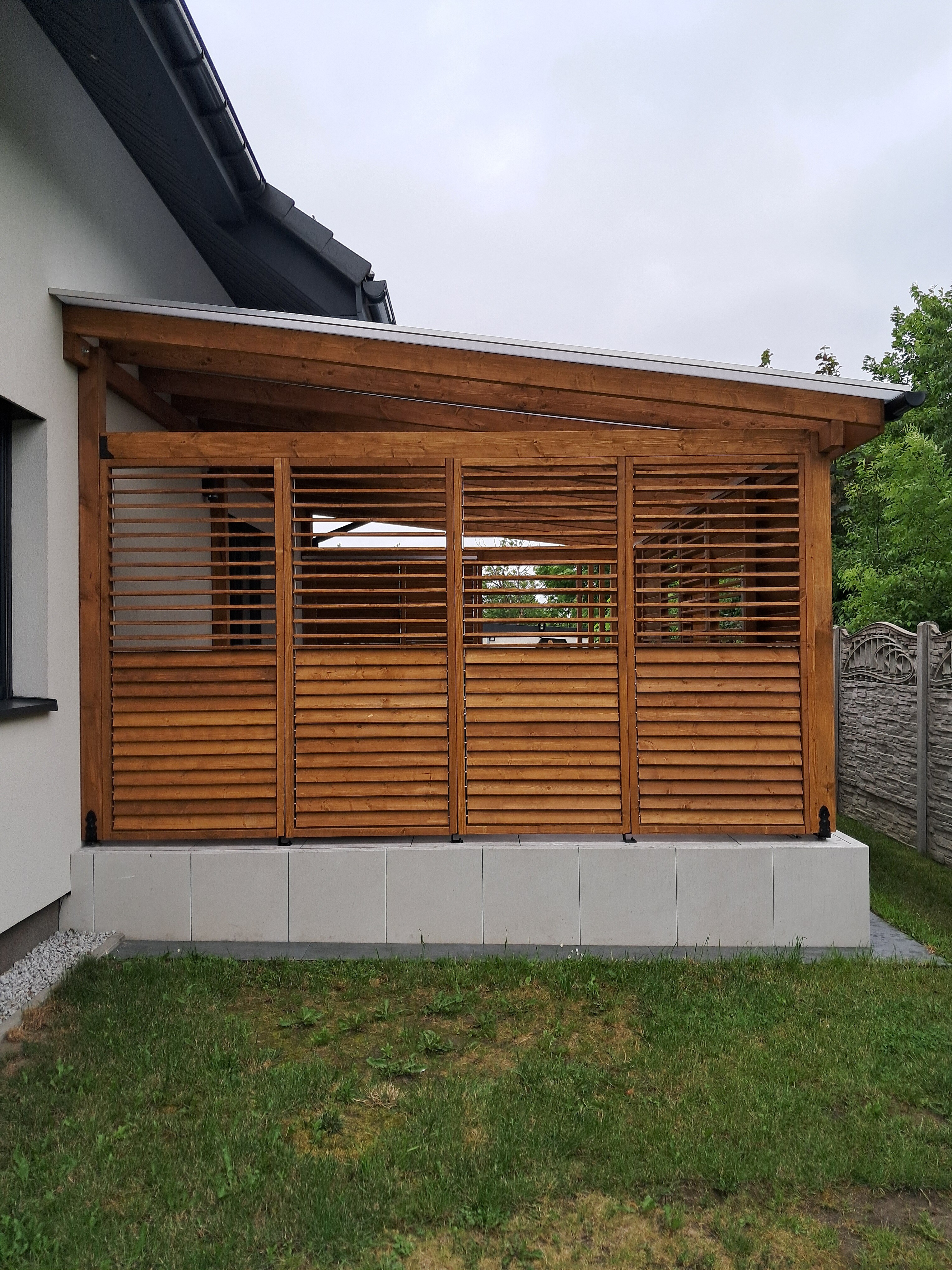 Drewniane zadaszenia tarasowe z regulowanymi panelami bocznymi
