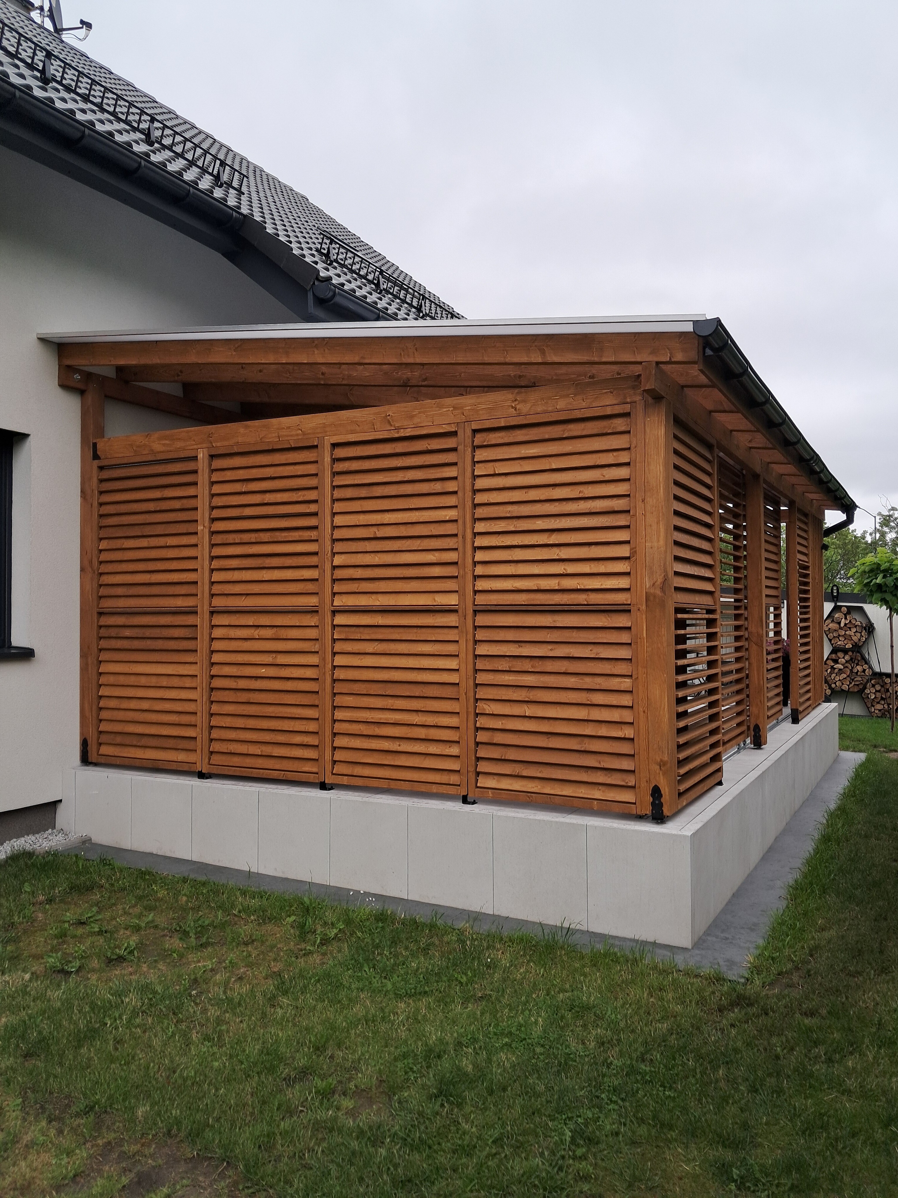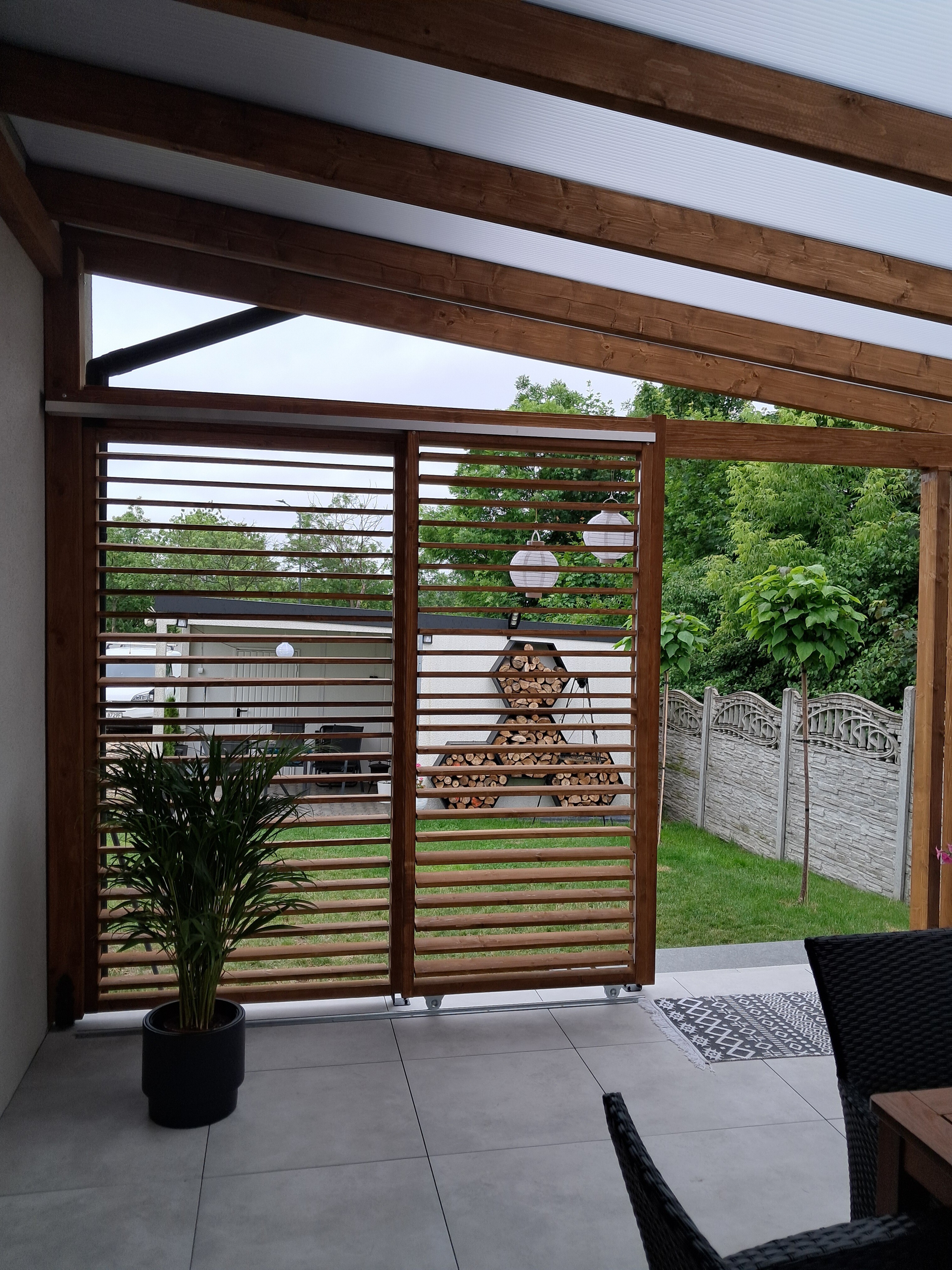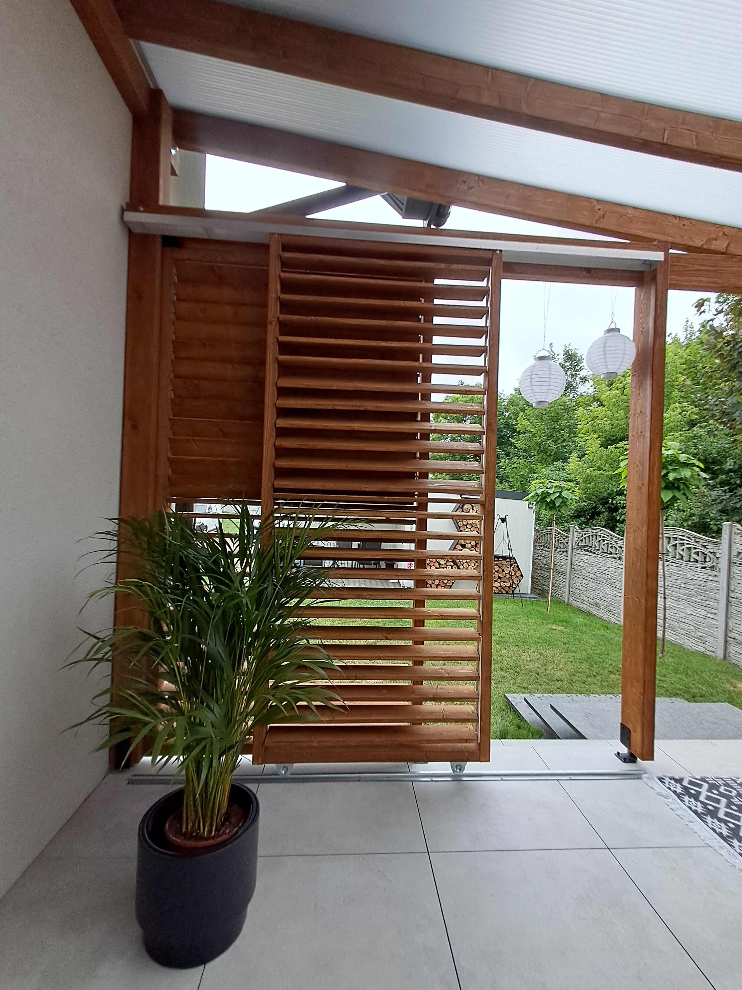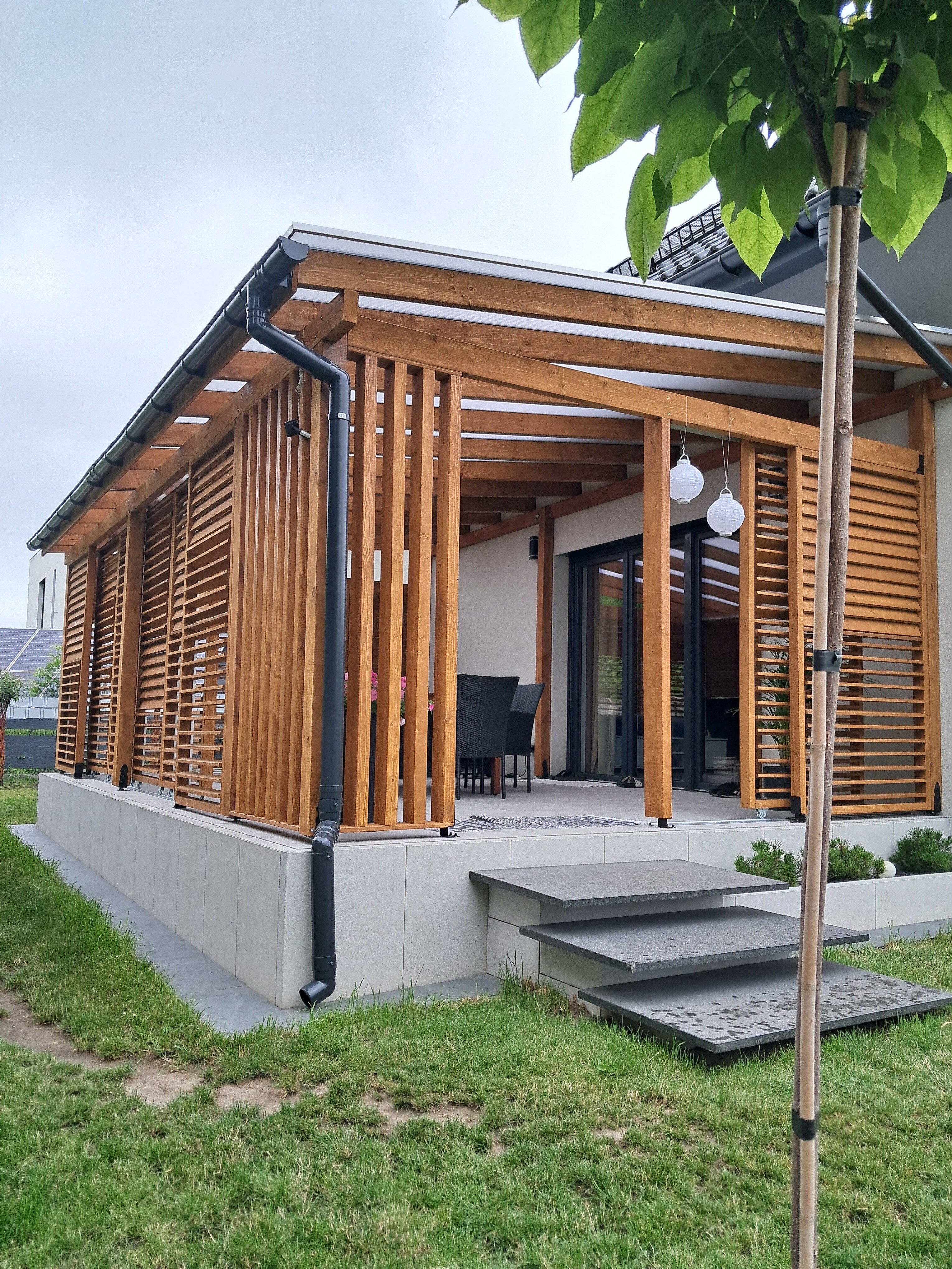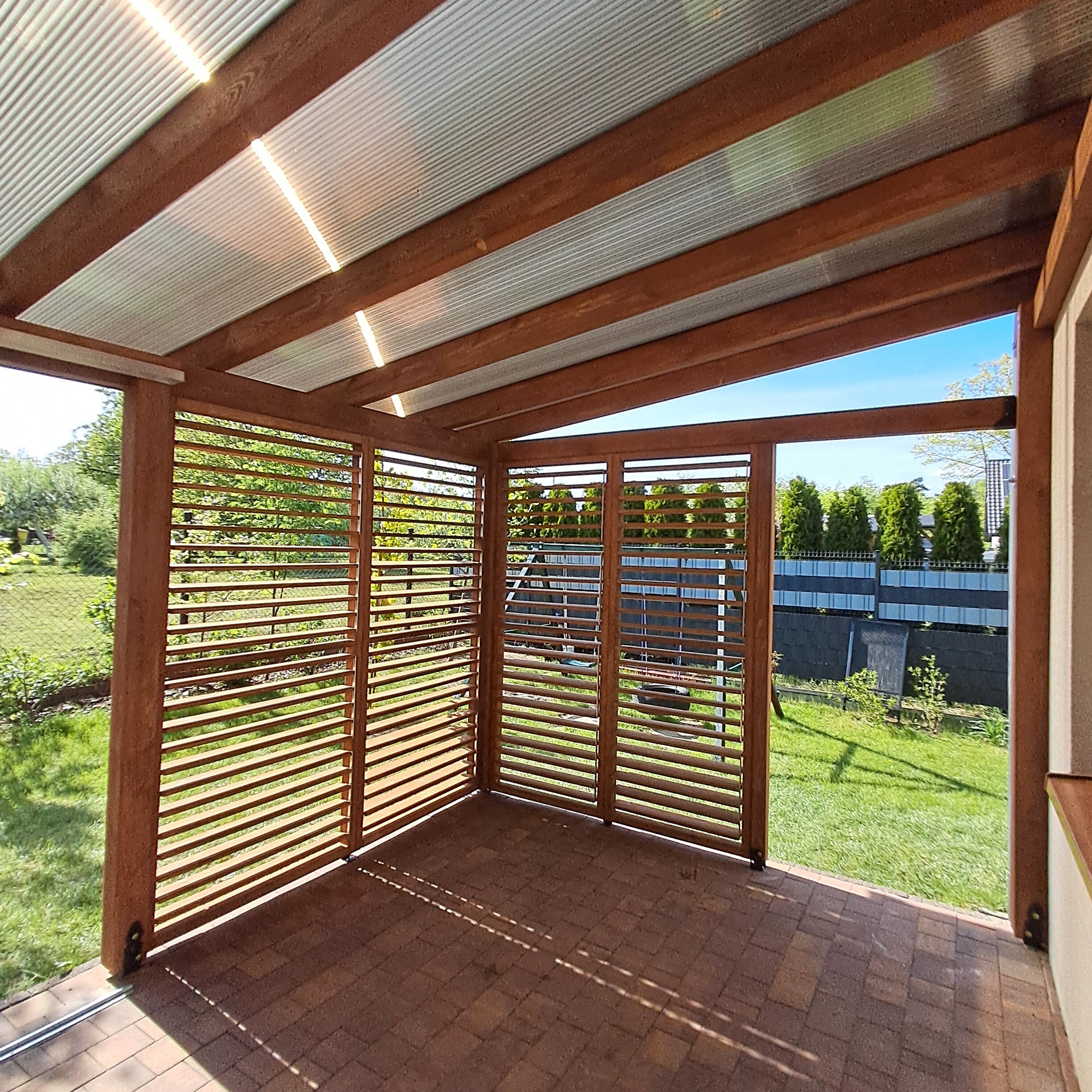 Drewniane zadaszenia tarasowe z regulowanymi panelami bocznymi
