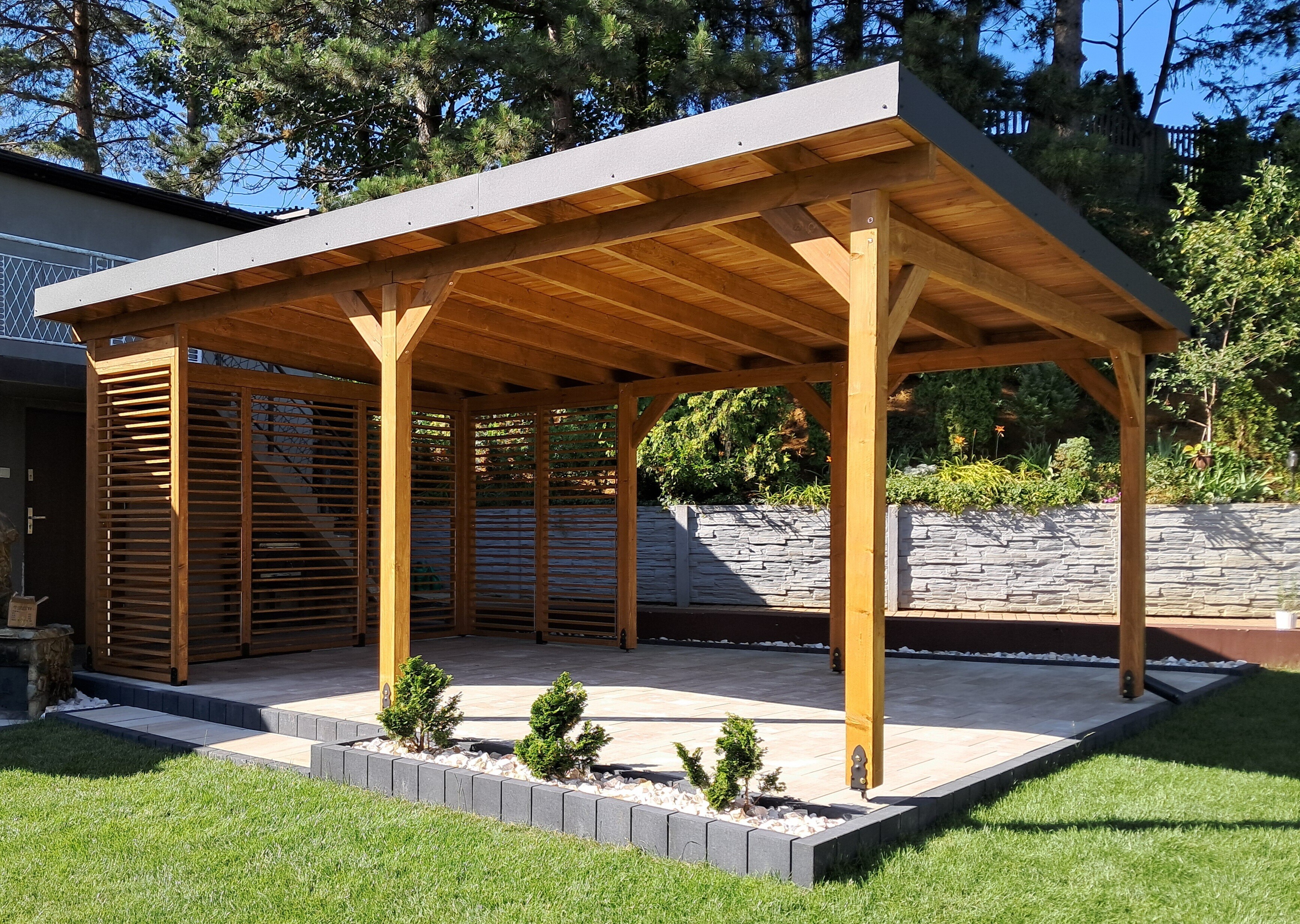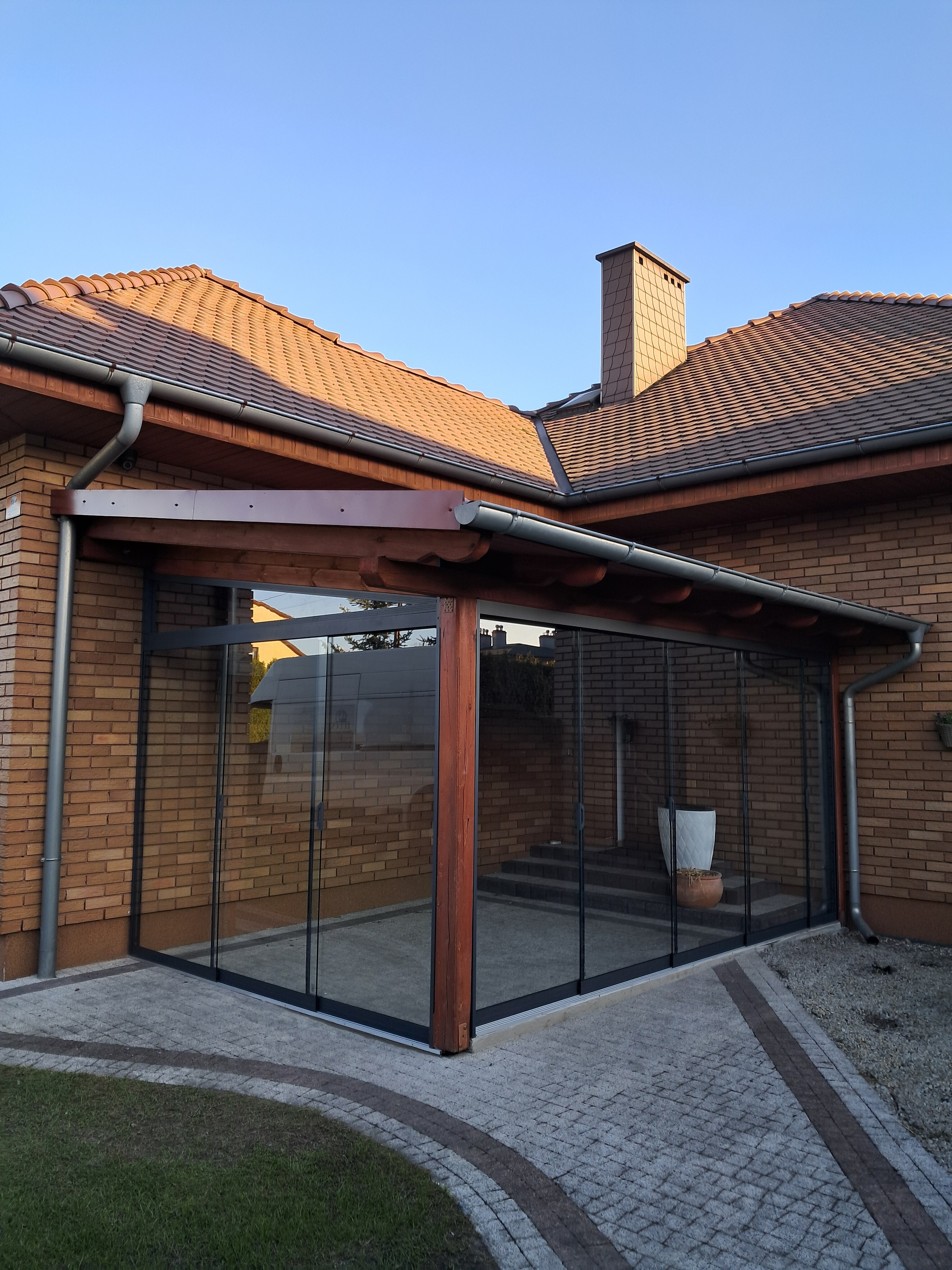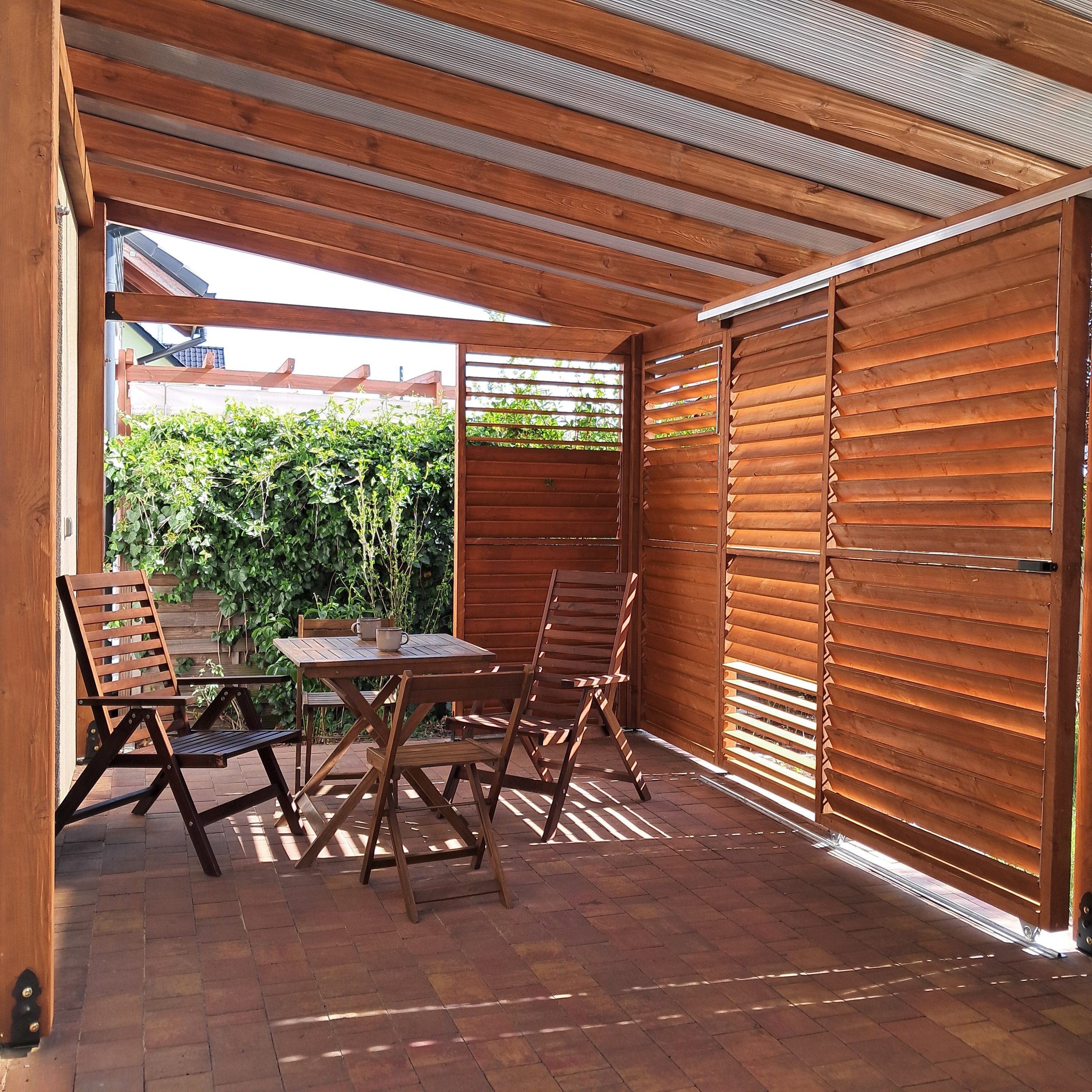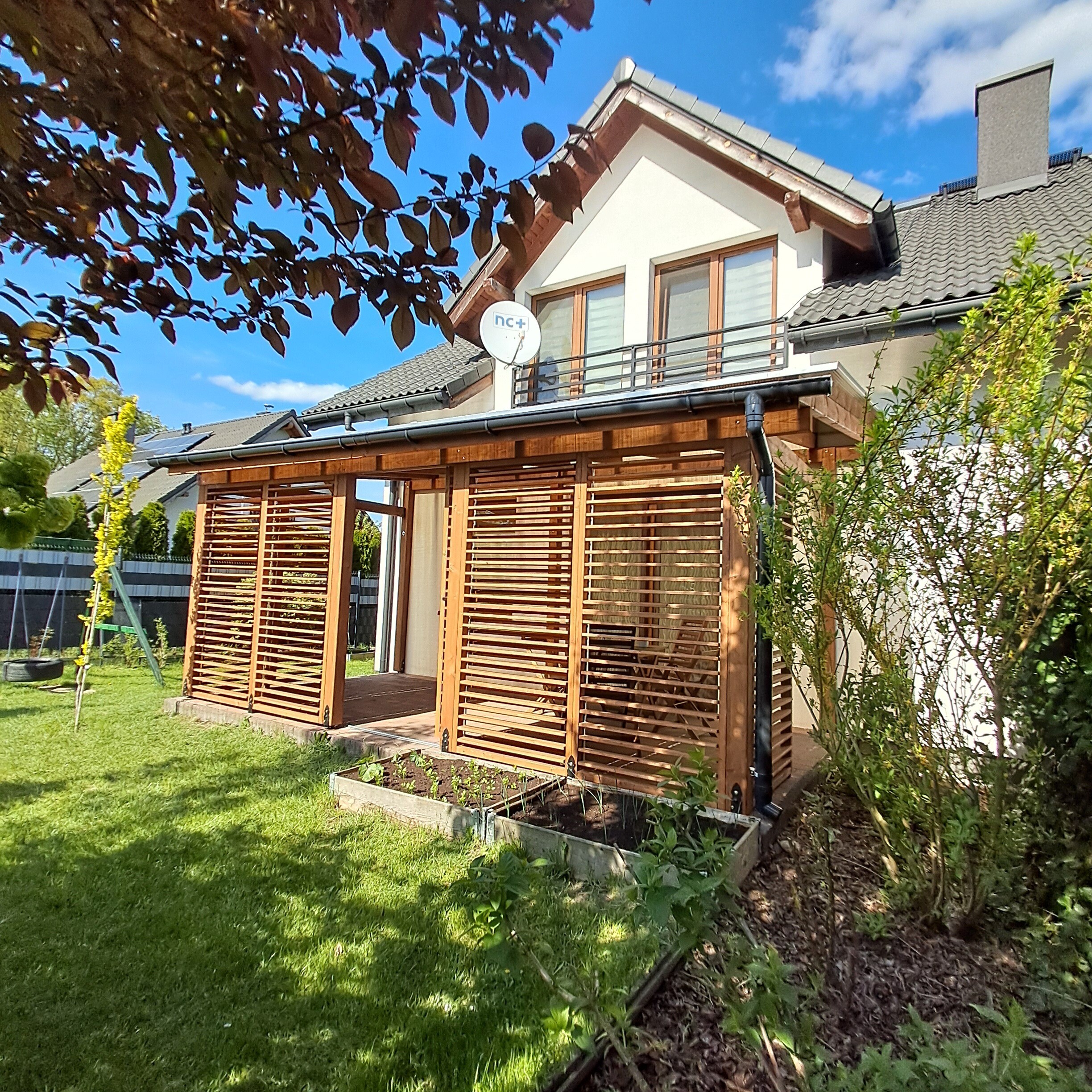 Drewniane zadaszenia tarasowe z regulowanymi panelami bocznymi